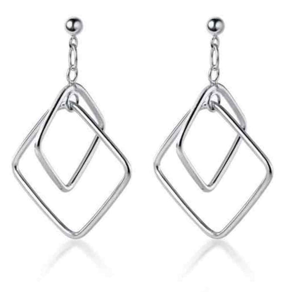 Dangle Silver Double Square Hoop Screw-Back Clip On Earrings
